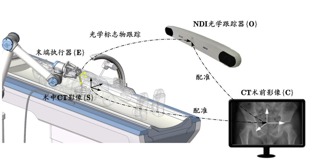 本专利所述系统共涉及四个主要坐标系,分别是光学定位坐标系{O}、CT术前影像坐标系{C}、机器人的末端执行器坐标系{E}和病人术中CT影像坐标系{S}。光学定位系统是一类位置测量系统。首先在需要跟踪的目标上附着一个无线的光学标记物。该标记物的形状和表面经过特殊处理,使得光学定位的激光发生器可以通过发射近红外光,来捕捉该类特殊标志物在自身定义坐标系下的位置。若同时附着数个标志物,形成一个标志物支架,则该定位系统可以同时 反馈该支架的位置和姿态信息。
